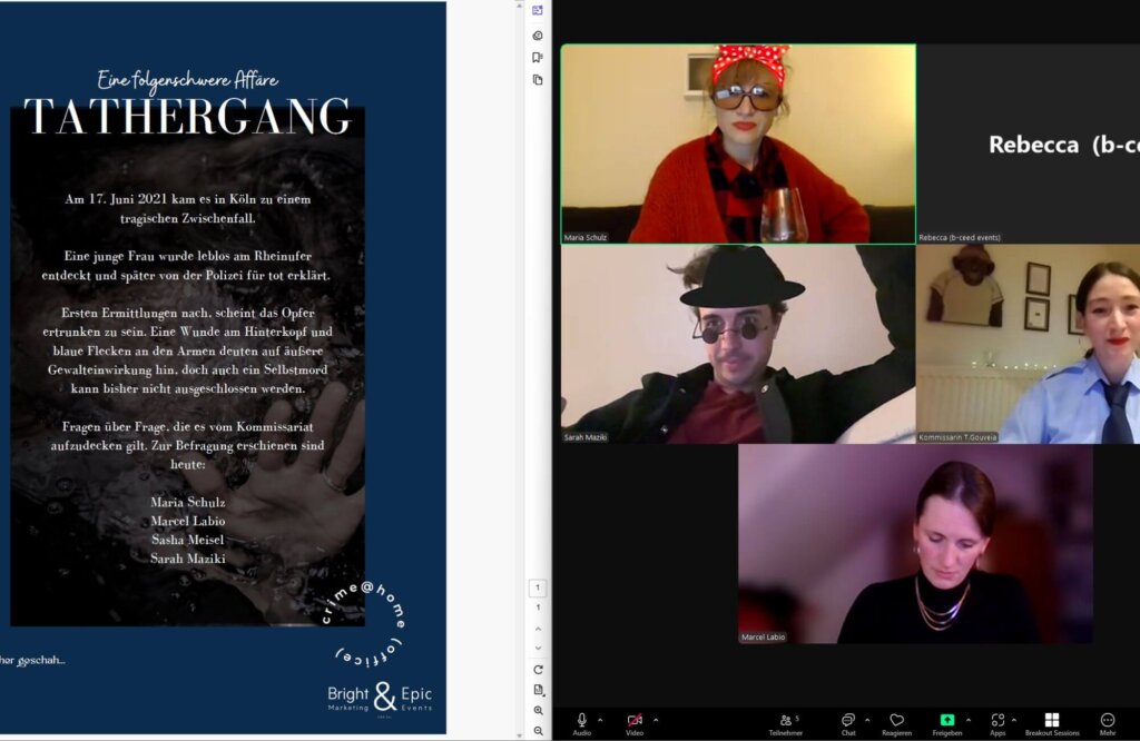 crime@home ist kein einfaches Krimispiel – es ist ein Erlebnis, das euer Team enger zusammenbringt, fördert und fordert. Seid ihr bereit, in die Welt der Ermittlungen, Intrigen und unerwarteten Wendungen einzutauchen? Stellt euch der Herausforderung und fragt jetzt unverbindlich euer persönliches Online-Krimi-Erlebnis bei teambuilder.de an!